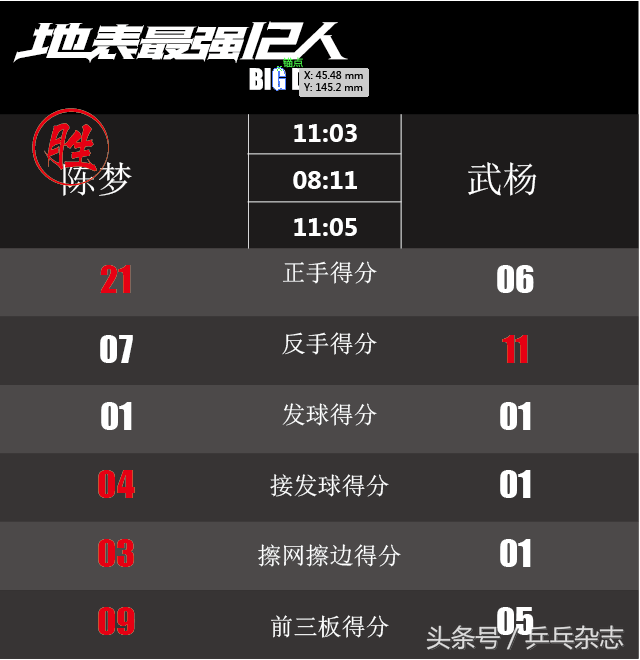 武杨“世界第一削”名不虚传,在比赛中,武杨削中带攻,大比分4:1战胜陈梦,晋级八强。