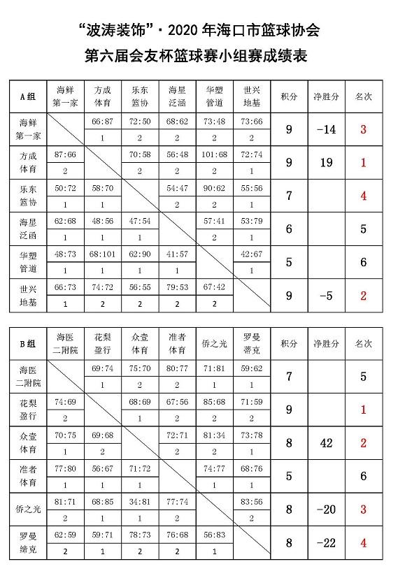 A组最后一场小组赛未打响前,小组出线名单已敲定,海鲜第一家、方成体育、世兴地基、乐东篮协提前锁定出线名额,海星泛函、华塑管道遗憾出局。