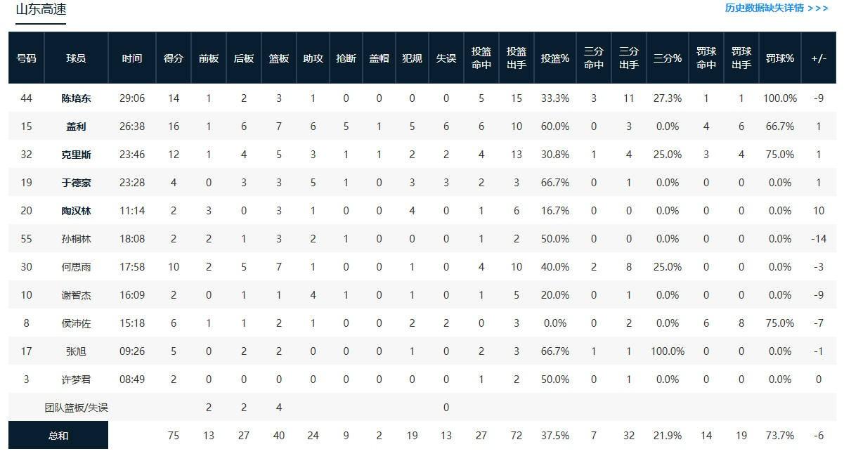 山东队有4人得分上双:盖利16分7板6助、陈培东14分3板1助、克里斯12分5板3助、何思雨10分7板1助。