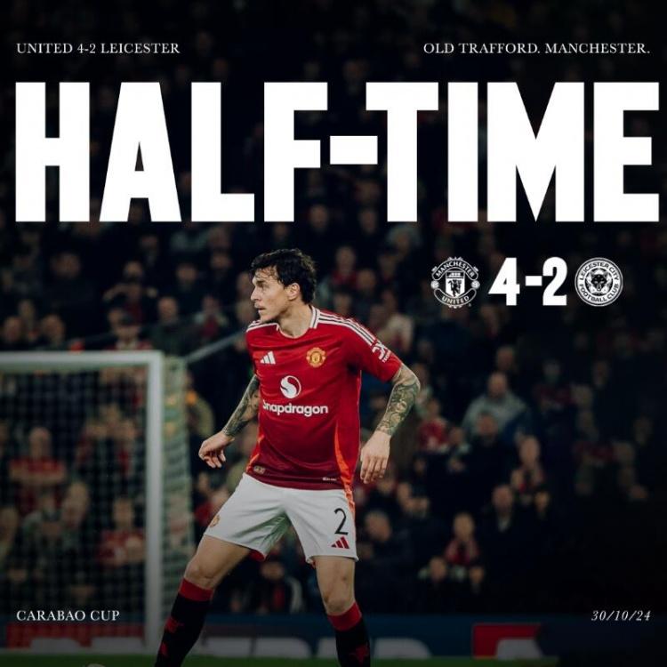 直播吧10月31日讯 联赛杯16强阶段,曼联主场迎战莱斯特城。本场比赛是滕哈赫下课后曼联首战,目前临时主帅是范尼。上半场,卡塞米罗双响,加纳乔、B费建功;埃尔哈努斯、考迪为莱斯特城打进2球。半场结束,曼联暂时4-2领先莱斯特城。