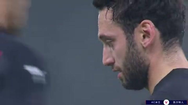 第24分钟,AC米兰第1球!恰尔汗奥卢!外围中路定位球直射,越过人墙落叶右下,巴卡斯毫无反应!AC米兰1-2凯尔特人!↓