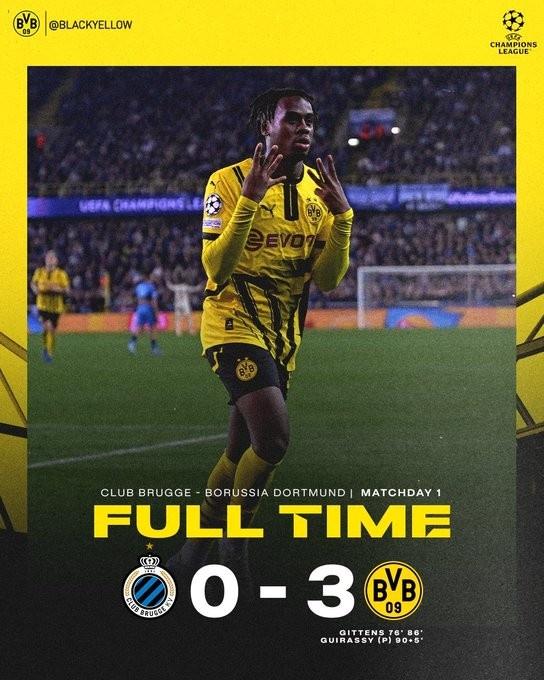 德甲豪门多特蒙德此役作客比利时挑战布鲁日,大黄蜂后程发力,在第76分钟才打入第一球,最终3-0击败对手。