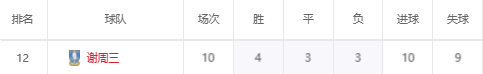 这赛季作为降班马,谢周三也没有能力在英甲联赛大杀四方,目前4胜3平3负,仅排第十二名。谢周三这赛季锋无力问题依旧显著,目前进球数在英甲排倒数第四(上赛季英冠进球数排倒数第五),虽然防守端目前仅丢9球,是英甲第二少,只比维冈竞技多丢了两球,但其实谢周三的场上的防守并没有数据显示的那么好。