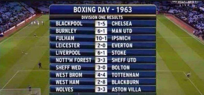 时光倒回1963-64赛季,英甲(当时的英格兰顶级联赛)在节礼日当天为我们送上了圣诞进球大礼,10场比赛一共出现了66粒进球,场均进球数达6.6粒。其中,单场进球数前二的比赛分别是:富勒姆10-1横扫伊普斯维奇,西汉姆联2-8惨败布莱克本。