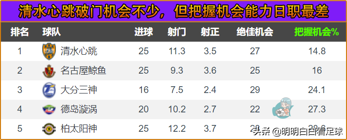 整个球队配合非常差,把握绝佳机会的比例只有14.8%,日职最差,所以战绩是远远低于他们应有水平的。