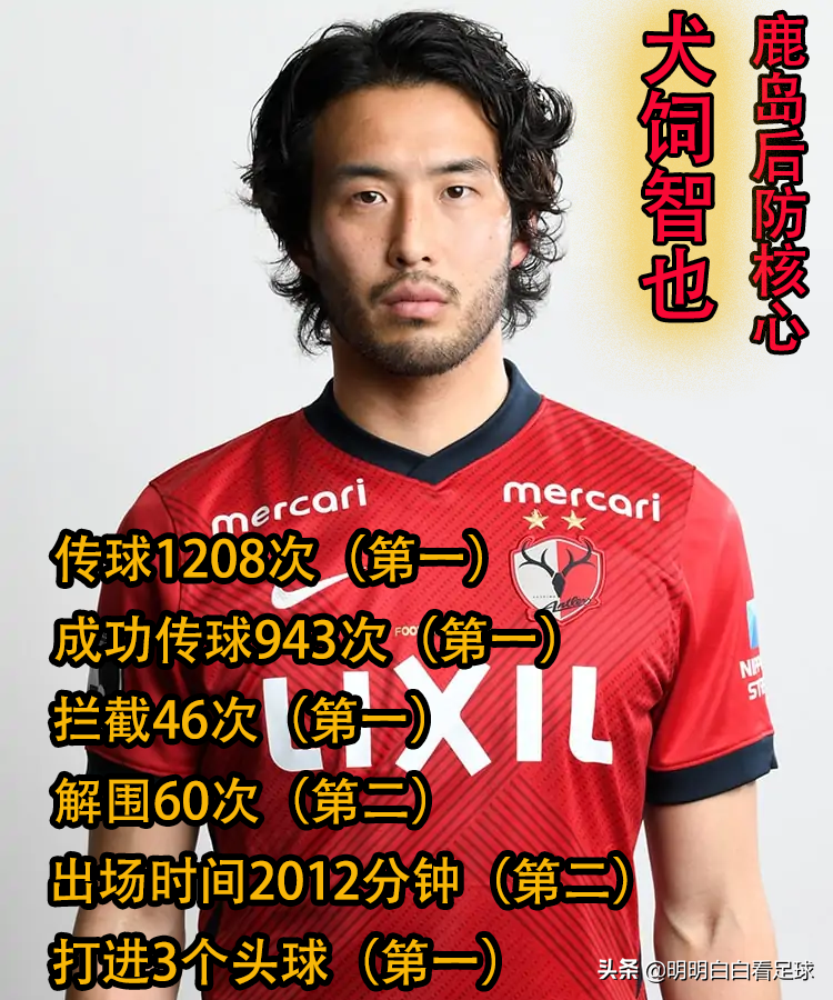 犬饲智也是鹿岛非常关键的球员,出场时间全队第二、仅次于门将。