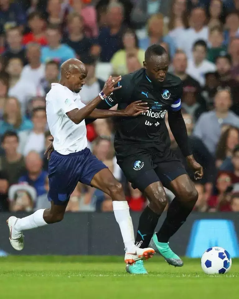 值得一天的是,英国长跑传奇人物莫法拉也参加了这场比赛,还在比赛中飞铲博尔特。
