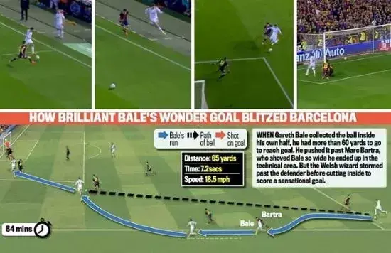 说到速度,足球场上奔跑的最高速度是皇马的贝尔创造的。还记得著名的“传给两秒后的自己”吗?在国王杯对阵巴萨的那场比赛,贝尔传给两秒后的自己时最高速度为34.7/km,65码(59.436米)的距离用时7.2秒,平均时速为29.773/km。不过这还不是他跑得最快的一次。