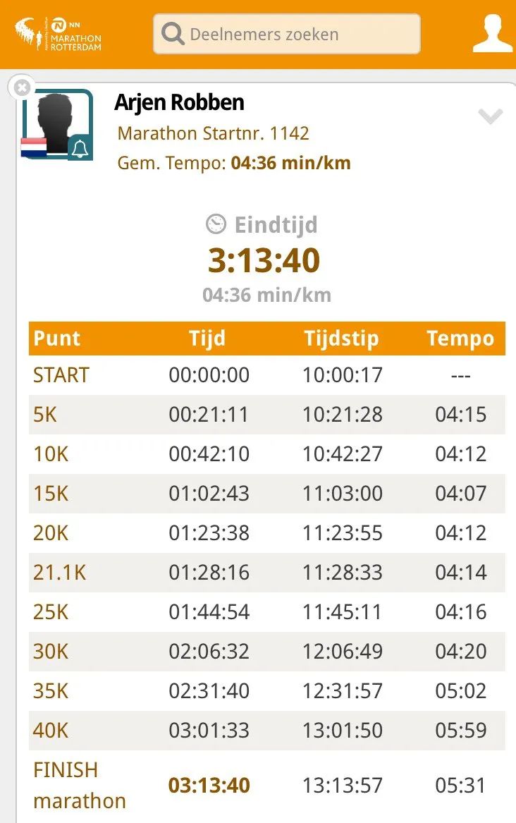 在今年举行的鹿特丹马拉松上,前荷兰国家队球员罗本首次参加全马比赛,就跑了 3:13:40 的成绩,平均配速 4 分 36 秒。