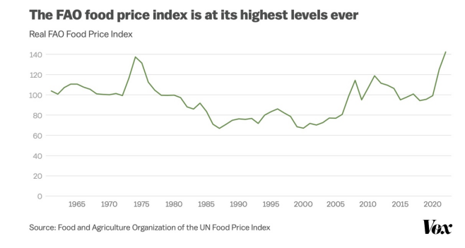 FAO追踪下的全球粮食价格波动。 Vox制图