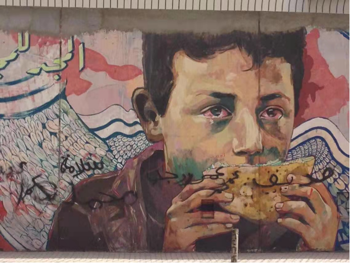 开罗解放广场附近穆罕默德·马哈茂德大街上的著名涂鸦“含泪吃饼的男孩”,现已被抹去。 澎湃新闻记者 喻晓璇 图