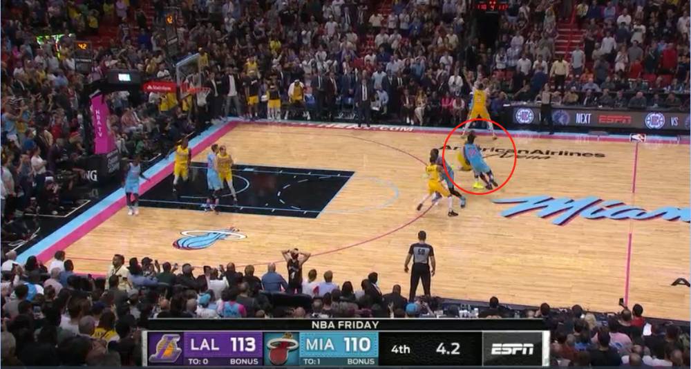 2.常规时间还剩4.2秒,巴特勒接界外传球,遭遇詹姆斯阻挡,应判罚詹姆斯阻挡犯规,但并未吹罚,此为漏判。