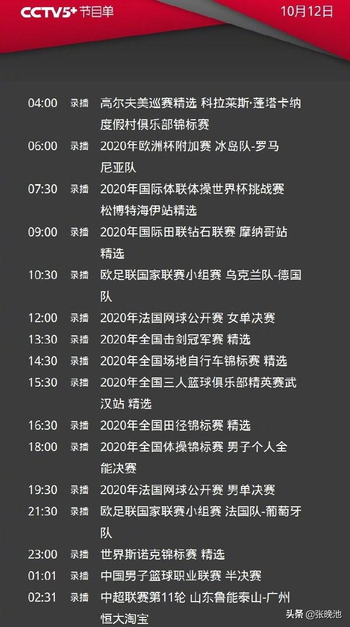CCTV5+将录播高尔夫美巡赛、欧洲杯附加赛、国际体联体操世界杯挑战赛、国际田联钻石联赛、欧国联小组赛、法网公开赛、全国击剑冠军赛、全国场地自行车锦标赛、全国三人篮球俱乐部精英赛、全国田径锦标赛、全国体操锦标赛、斯诺克世锦赛、中超、CBA半决赛等比赛和节目。