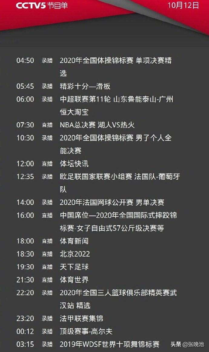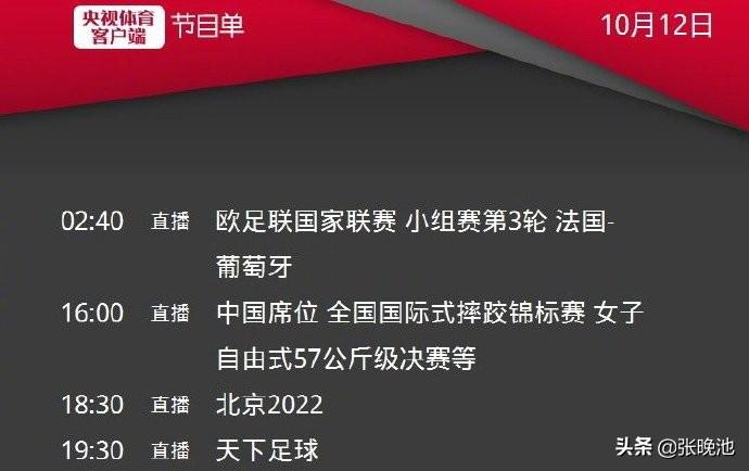 北京时间10月12日(周一),中央广播电视总台已经通过官微发布了体育频道(CCTV5)、央视体育客户端(CCTV5APP)和央视体育赛事频道(CCTV5+)今日最新节目单。虽然是周一,但央视体育赛事直播依然精彩,篮球、足球、摔跤等比赛项目和专题节目将上演。CCTV5和CCTV5APP都将直播中国国际式摔跤锦标赛,CCTV5直播NBA总决赛迈阿密热火对决洛杉矶湖人、专题节目北京2022和天下足球,CCTV5APP直播欧国联葡萄牙男足对决法国男足。