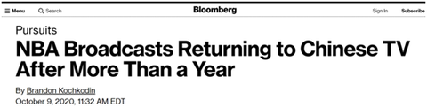 《福布斯》杂志称,在1年前中央广播电视总台暂停NBA赛事转播后,修补和中国的关系一直是NBA的优先事项。NBA总裁亚当·肖华曾形容与(中国关系)破裂带来的损失是“巨大的”,并称可能带来数亿美元损失。