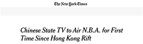 《纽约时报》:自香港议题造成裂痕以来,中国国家电视台首次播出NBA(赛事)