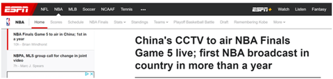 ESPN:中国中央电视台将播出NBA总决赛第五场 系NBA一年多来首次在中国国内转播