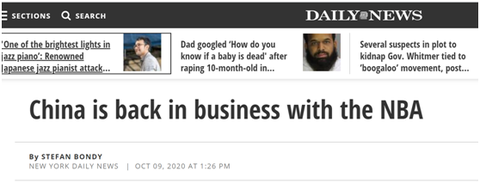 美国《每日新闻》:中国恢复与NBA合作