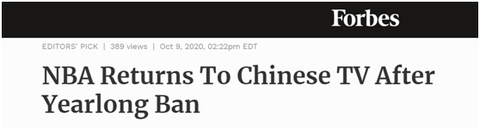 《福布斯》:NBA在被禁播一年之后重返中国电视荧屏