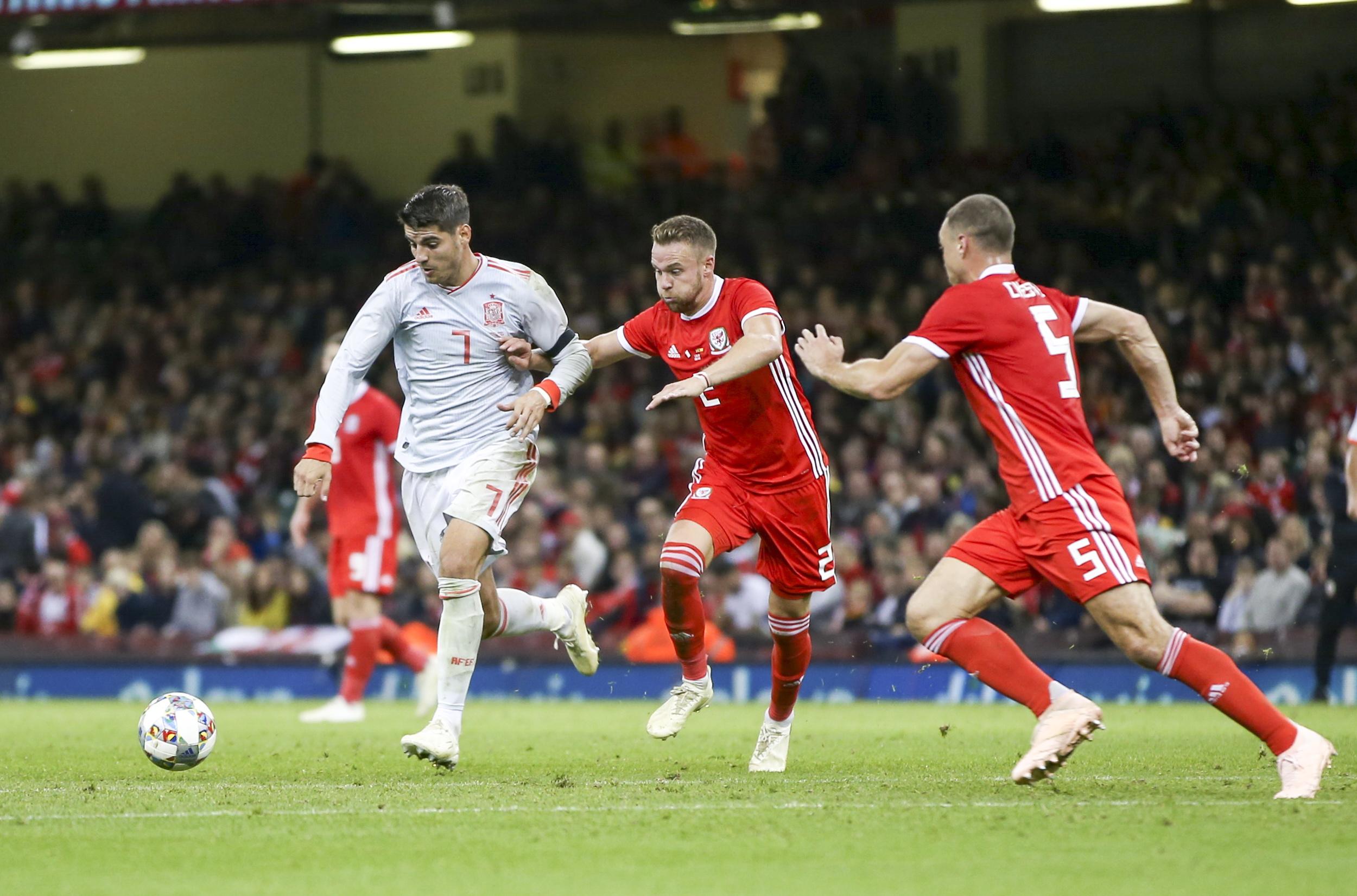 10月11日,西班牙队球员莫拉塔(左)与威尔士队球员冈特拼抢。