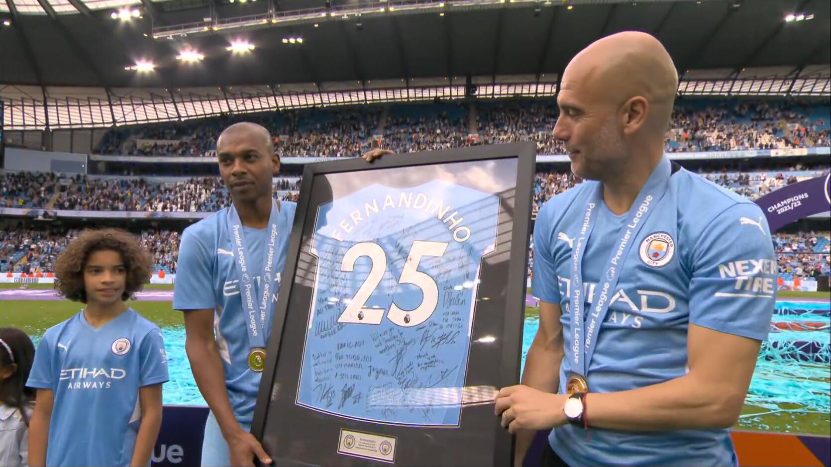 37岁的蓝月队长费尔南迪尼奥,在本场完成9年蓝月生涯的告别战。赛后,曼城官方为费鸟举办告别仪式。