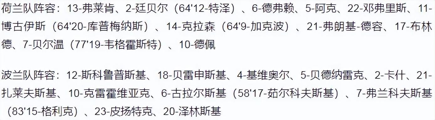 荷兰首发:13-弗莱肯、2-J-廷贝尔(64'12-特泽)、6-德弗赖、5-阿克、22-邓弗里斯、11-博古伊斯(64'20-库普梅纳斯)、14-克拉森(64'9-加克波)、21-弗朗基-德容、17-布林德、7-贝尔温(77'19-韦格霍斯特)、10-德佩