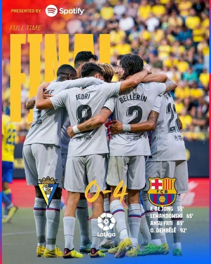 比赛第92分钟,登贝莱的进球为这场客场比赛画上句号!最终巴萨在客场4-0战胜加的斯,收获新赛季联赛四连胜!