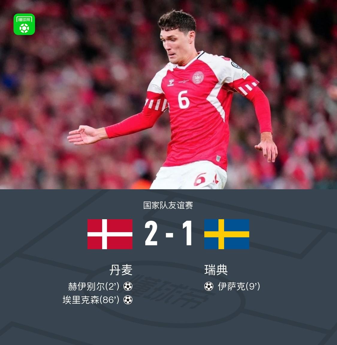 在国家队友谊赛中,丹麦与瑞典展开激烈对决。上半场,埃里克森角球开出,赫伊别尔抢前点破门将比分改写,伊萨克左路得球破门将比分扳平。下半场,尤尔曼德助攻,埃里克森外围一脚世界波破门将比分超出。最终丹麦2-1战胜瑞典。