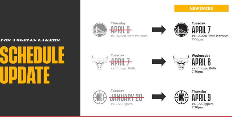 公牛原计划4月8日作客湖人的比赛改到4月9日11点30开打。