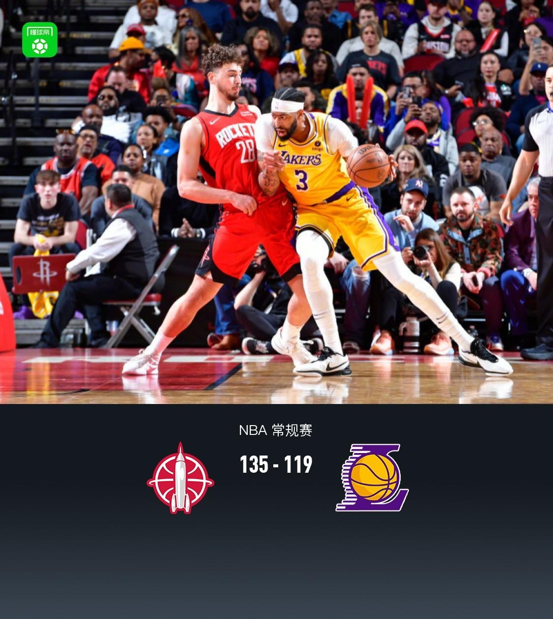 第四节火箭申京拿下8分,湖人八村垒拿下11分,最终火箭135-119战胜湖人