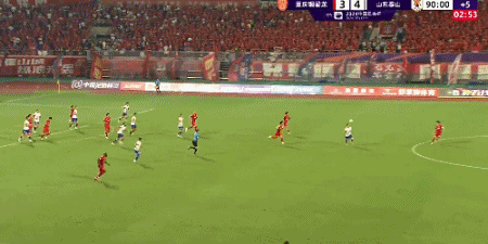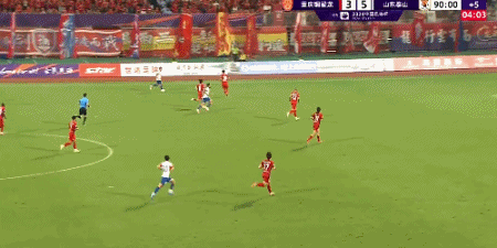 第90分钟,德尔加多单刀低射,山东泰山5-3领先