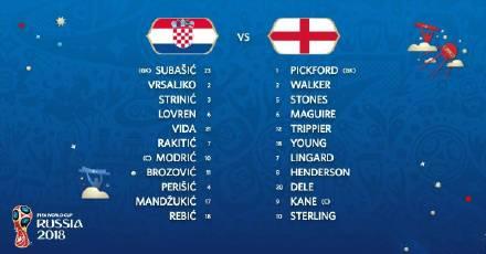 克罗地亚:23-苏巴西奇、2-弗尔萨利科、21-维达、6-洛夫伦、3-斯特里尼奇、7-拉基蒂奇、10-莫德里奇、18-雷比奇、4-佩里西奇、11-布罗佐维奇、17-曼朱基奇;
