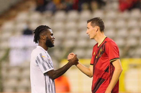↑10月8日,科特迪瓦队球员凯西(左)与比利时队球员瓦纳肯在比赛后握手致意。