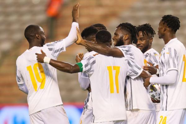 ↑10月8日,科特迪瓦队球员凯西(右三)在打入点球后与队友庆祝。
