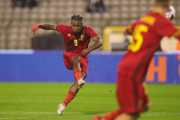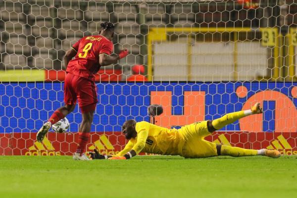 ↑10月8日,比利时队球员巴舒亚伊(左)在比赛中破门。