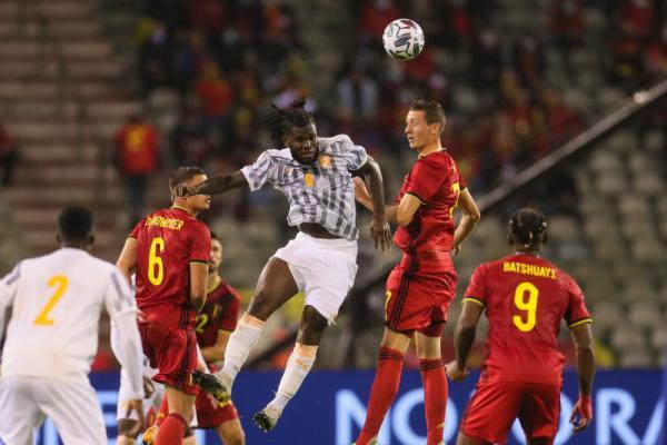 ↑10月8日,科特迪瓦队球员凯西(右三)与比利时队球员瓦纳肯(右二)在比赛中争顶。