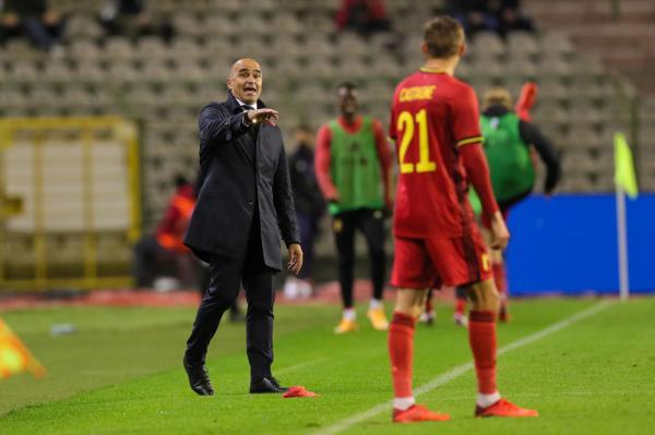 ↑10月8日,比利时队主教练马丁内斯(左)在比赛中指导球员。