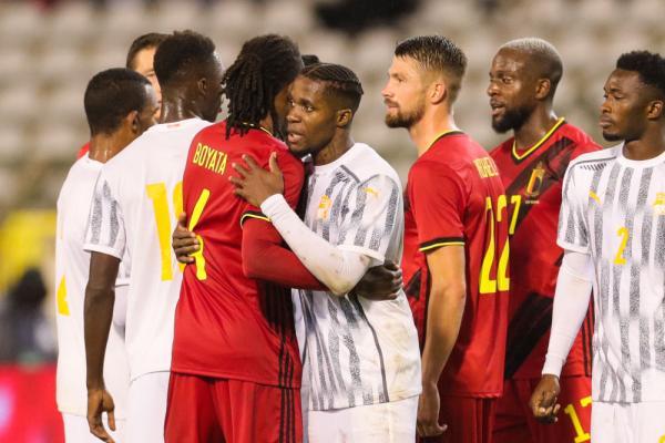 ↑10月8日,科特迪瓦队球员扎哈(右四)与比利时队球员博亚塔(左四)在比赛后相互致意。