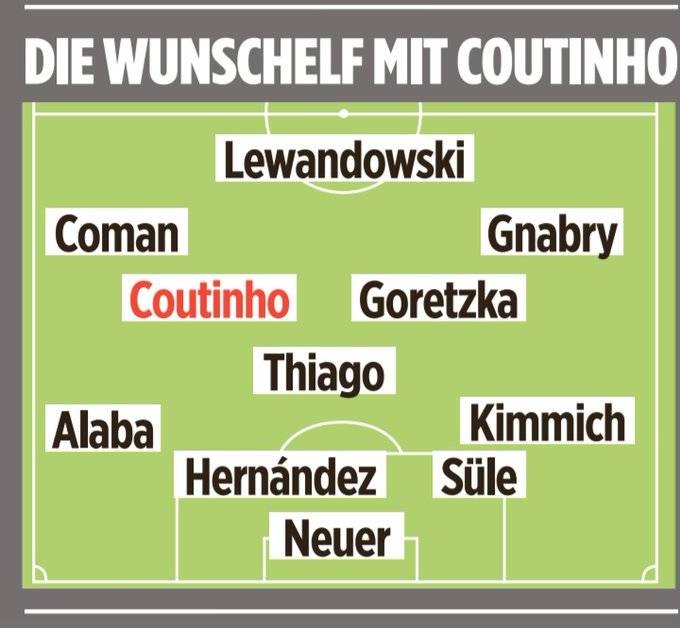 从图片中可以看出,前场三叉戟仍是莱万、科曼和格纳布里;而新援库蒂尼奥则是出现在了左中场的位置,另外两人分别是格雷茨卡和蒂亚戈;后防线上阿拉巴和基米希分居左右,新援卢卡斯-赫尔南德斯和聚勒搭档中后卫;门将位置没有悬念,诺伊尔当之无愧。