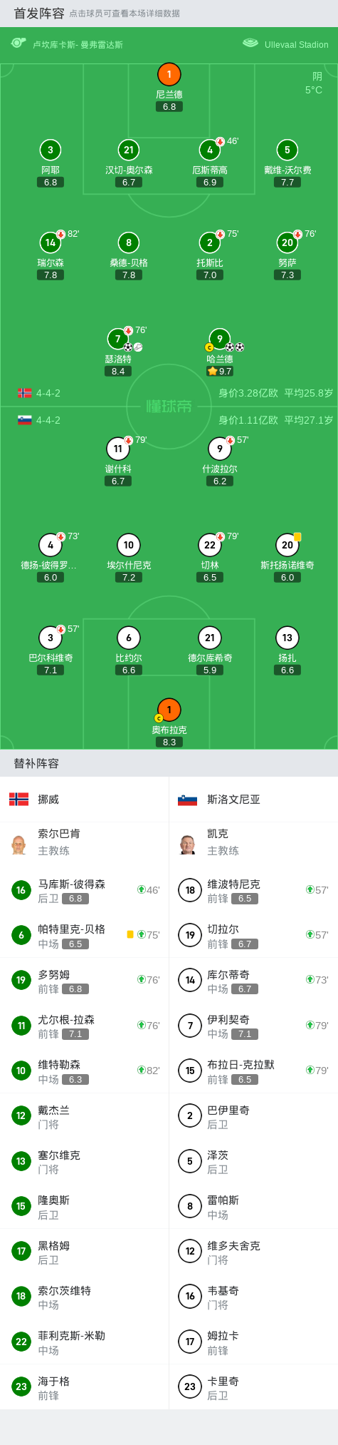 开场仅第7分钟,努萨左路内切劲射,奥布拉克扑救脱手,哈兰德跟上补射入网,挪威1:0斯洛文尼亚,第53分钟,哈兰德禁区内反抢,索尔洛特迎球扫射,挪威2-0斯洛文尼亚。