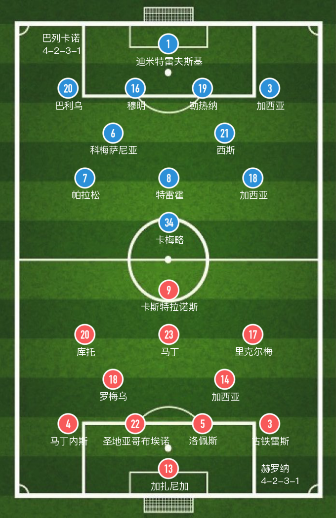 赫罗纳(4-2-3-1): 13-加扎尼加,4-马丁内斯,22-圣地亚哥布埃诺,5-洛佩斯,3-古铁雷斯,18-罗梅乌,14-加西亚,20-库托(71' 11-费尔南德斯),23-马丁(72' 10-山姆赛兹),17-里克尔梅(71' 12-比利亚),9-卡斯特拉诺斯(79' 7-斯图亚尼)