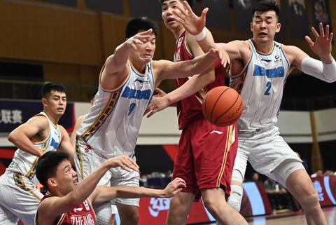 11月8日,北京首钢队球员李慕豪(右一)、雷蒙(右三)在比赛中拼抢。