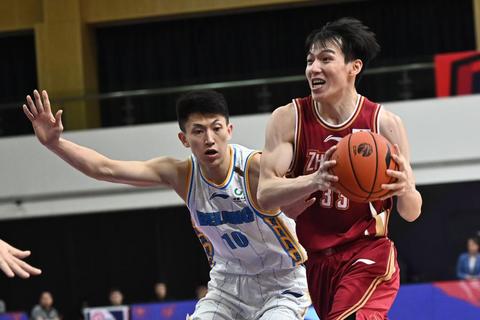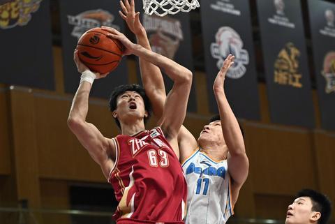 11月8日,浙江稠州金租队球员赖俊豪(左)在比赛中上篮。