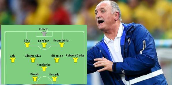 在斯科拉里手下,巴西队以3412或343阵型出战,球队在三条线上均有不俗表现。虽然埃莫森在训练场上因为顽皮客串门将受伤,但巴西队多名球员发挥出色。门将马科斯虽然未曾闯荡欧洲足坛,但7场比赛仅仅丢掉4球并连续奉献了多个精彩扑救还是功不可没。三名中卫中,卢西奥、埃德米尔森以及罗克-儒尼奥尔位置稳固,埃德米尔森还在对阵哥斯达黎加的小组赛中上演了倒钩破门的好戏。在中场方面,两位边翼卫卡福与罗伯特-卡洛斯往返能力出色,能最大限度的强化攻守两端。最然没有了埃莫森,但吉尔伯托-席尔瓦以及克莱伯森的出色发挥还是给防线带来了足够的屏障。