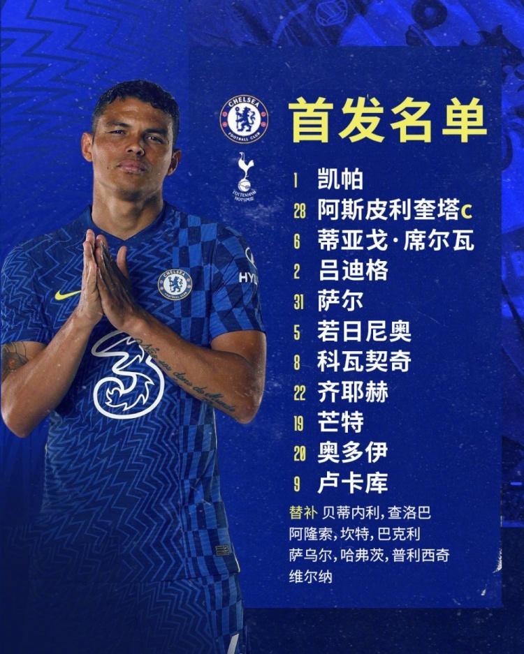 切尔西首发(4-2-2-2):1-凯帕、28-阿兹皮利奎塔、6-蒂亚戈-席尔瓦、2-吕迪格、31-萨尔、5-若日尼奥、8-科瓦西奇、22-齐耶赫、19-芒特、20-奥多伊、9-卢卡库