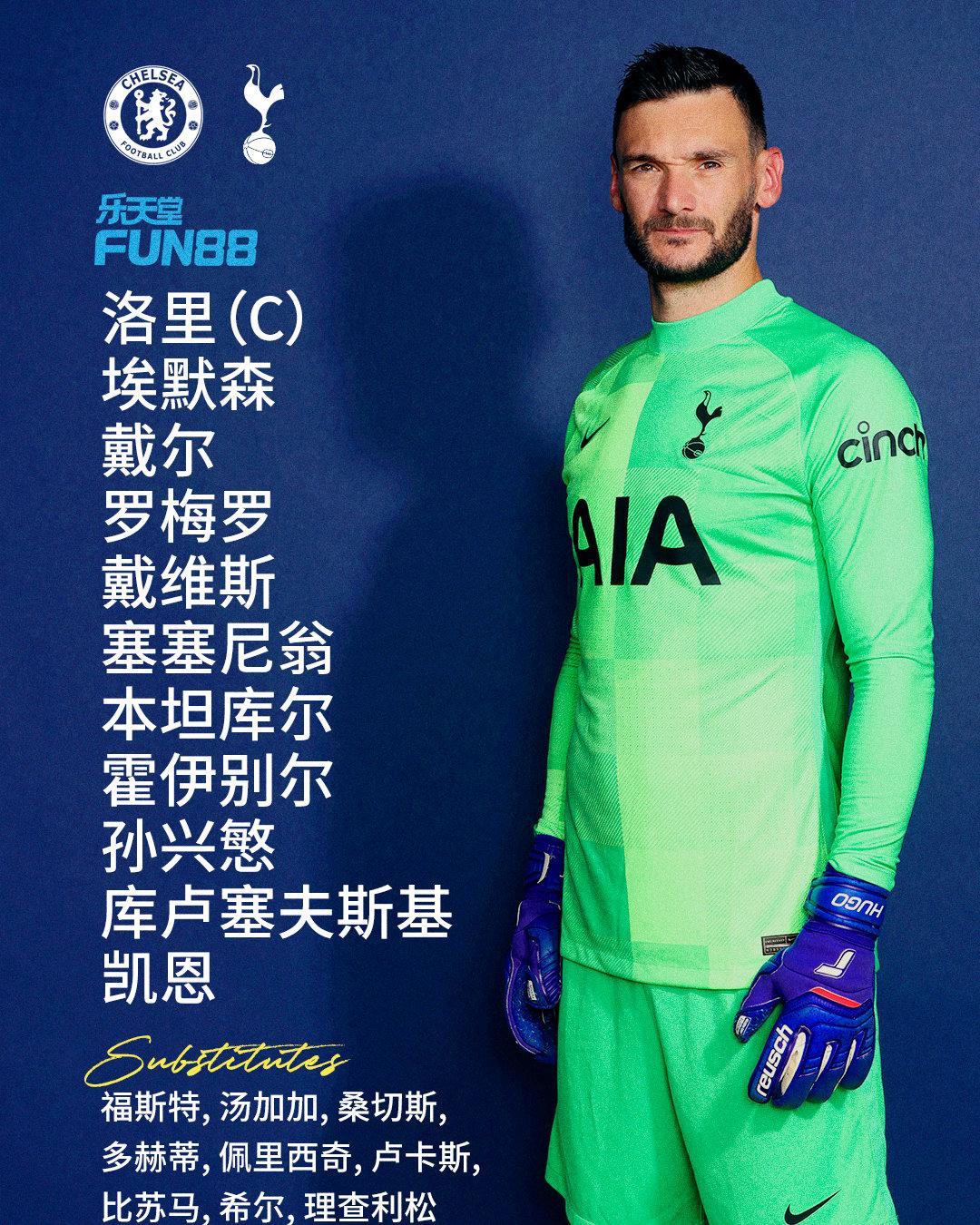 热刺首发(3-4-3):1-洛里、25-坦甘加、6-桑切斯、15-戴尔、33-戴维斯、2-多赫蒂、5-霍伊别尔、8-温克斯、19-塞塞尼翁、23-贝尔温、10-凯恩
