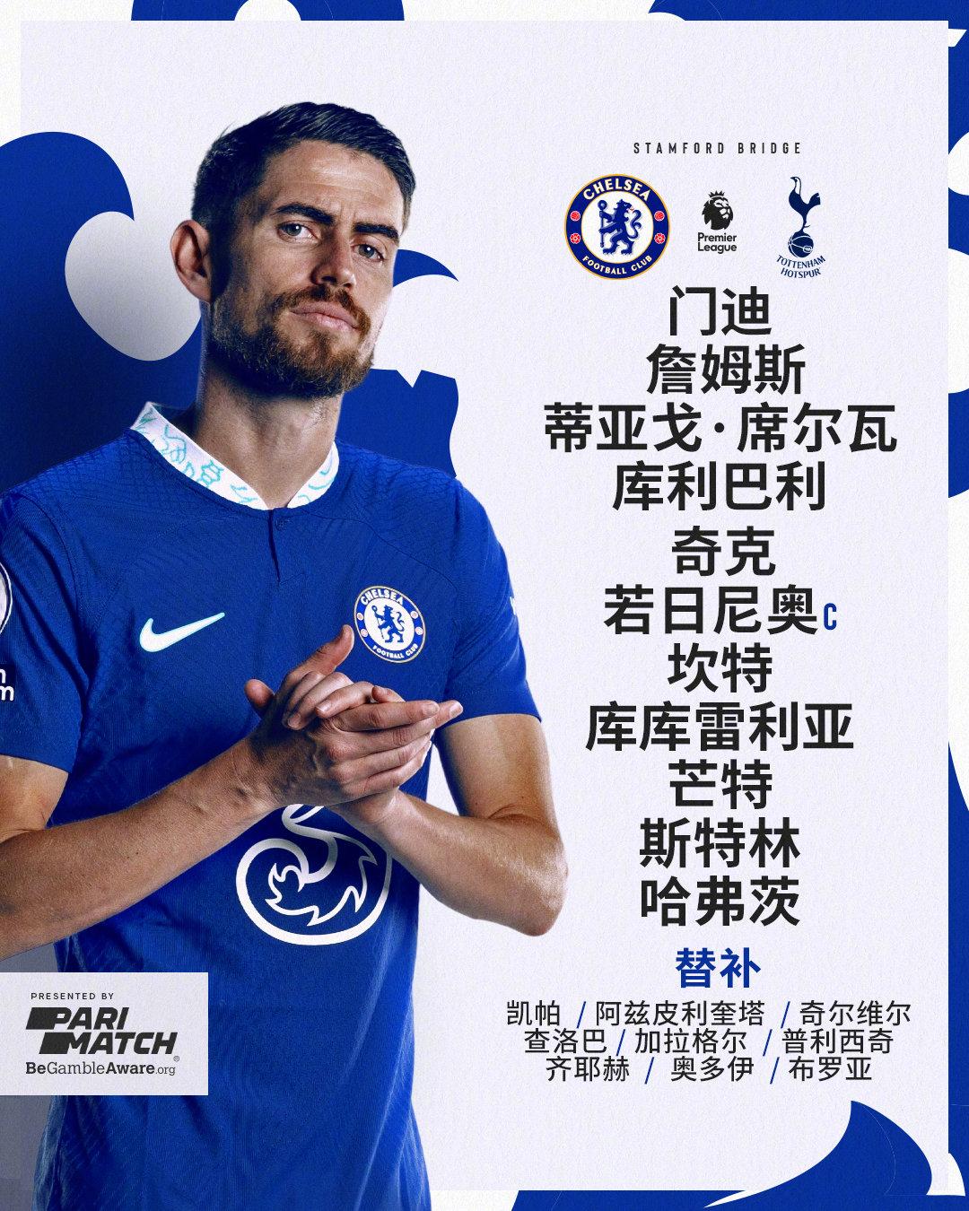 切尔西首发:16-爱德华-门迪、24-里斯-詹姆斯、6-蒂亚戈-席尔瓦、26-库利巴利、32-库库雷利亚、5-若日尼奥、7-坎特、12-奇克、19-芒特、17-斯特林、29-哈弗茨