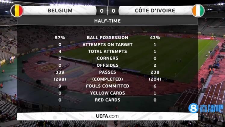 直播吧10月8日讯 北京时间10月9日2:45,国际A级热身赛比利时vs科特迪瓦。上半时双方均无建树。下半时巴舒亚伊为比利时打破僵局,尾声阶段扎哈造点,凯西点射绝平。最终,比利时1-1科特迪瓦。
