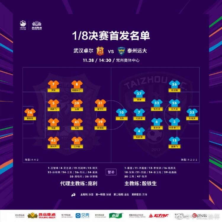 直播吧11月28日讯 足协杯第二轮,武汉卓尔对阵泰州远大,赛前首发阵容已公布。