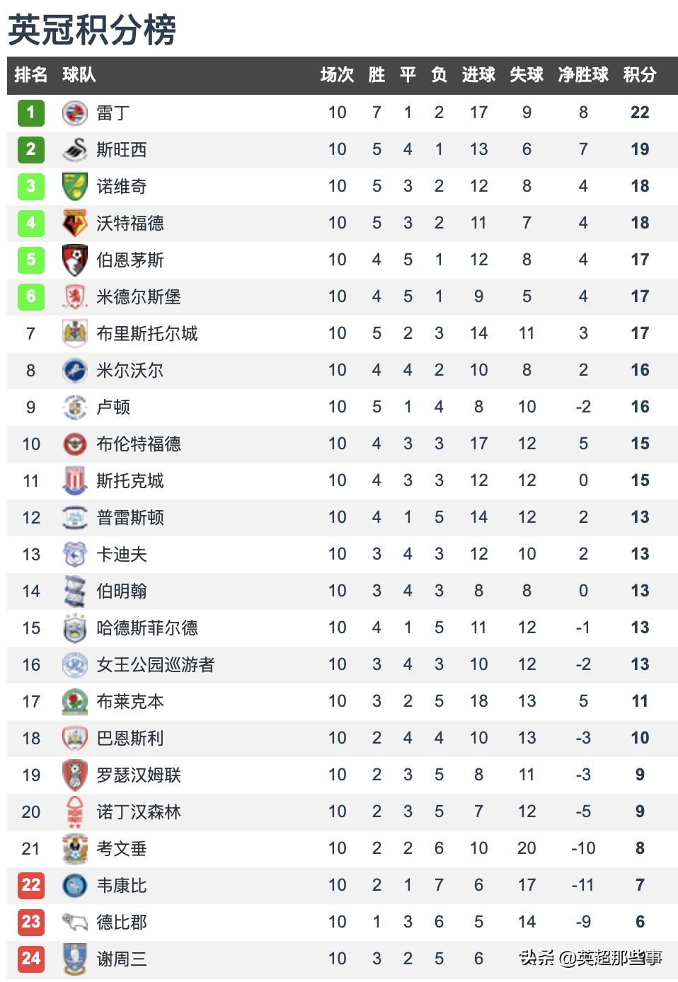 本周中,英冠联赛第10轮全部结束,领头羊雷丁主场0-3惨败给普雷斯顿,遭到2连败,仍以3分优势领跑;伯恩茅斯客场0-1输给谢周三,不败金身告破,至此英冠已经没有不败球队;鲁尼所在的德比郡主场0-1输球,进一步跌至倒数第二位。